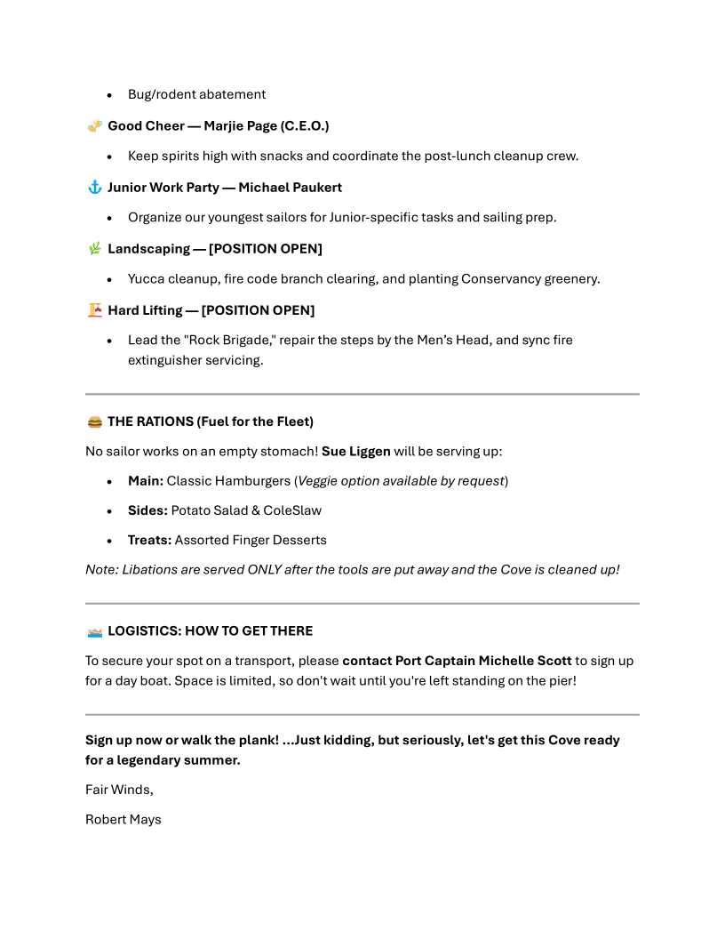 Note: Michelle Scott is offering to take up to 8 people over on her boat (Trifecta) as a day boat. if you are requesting a day boat, please make the request by answering the question as part of the registration process. If you are willing to take others over on YOUR BOAT, please let Fleet Captain Robert Mays know. We will attempt to accommodate everyone (on a first requested-first served basis) but space may be limited.